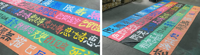 黒色ロール紙・・・オススメカラー 赤色・山吹色・蛍光ピンク シックなイメージからモダンテイストまで様々な表現が可能です。 カラー書道液を使って書いてみました>> |